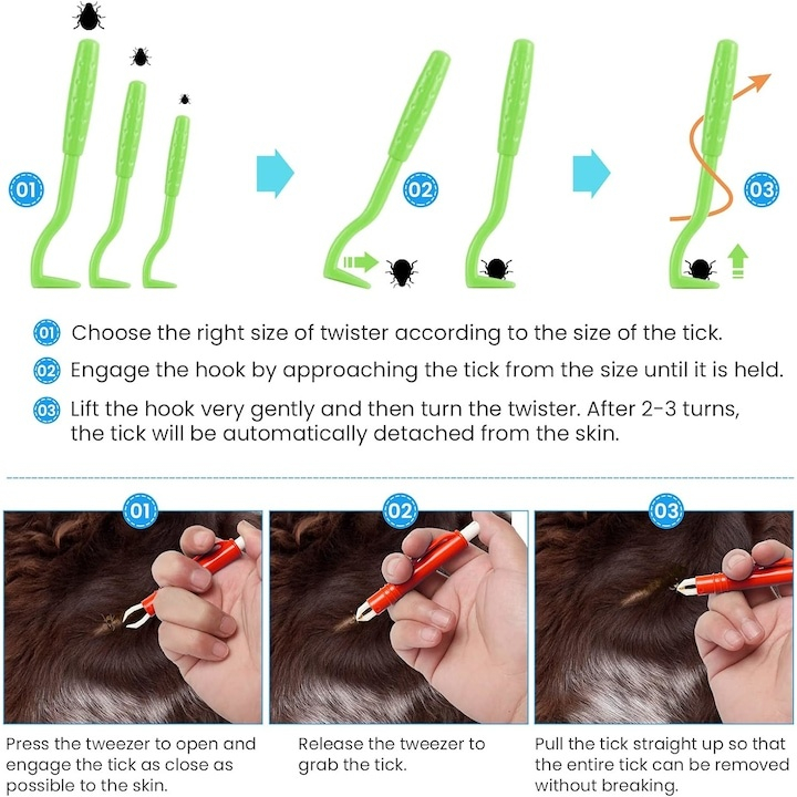 Setul contine 7 piese special concepute pentru diferite situatii si dimensiuni de capuse. Cele 3 carlige de dimensiuni diferite permit extragerea usoara a capuselor mici, medii sau mari, fara a le presa sau rupe. Acestea sunt ideale pentru utilizare atat pe pielea oamenilor, cat si pe animale precum caini sau pisici, oferind control si precizie in timpul utilizarii.