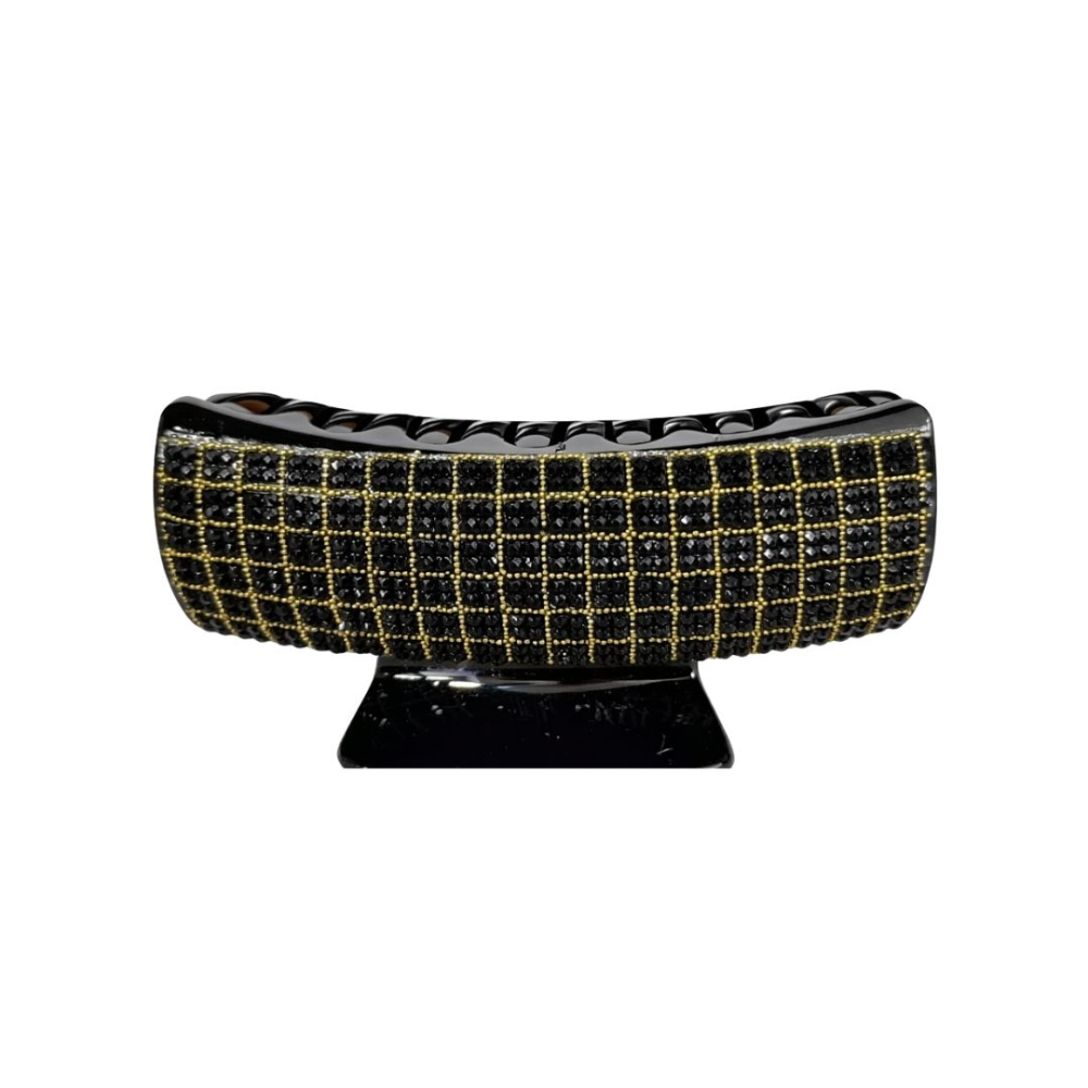 Clama de par eleganta in finisaj negru lucios, decorata cu cristale negre dispuse in model geometric cu insertii aurii, ideala pentru coafuri moderne si aparitii rafinate. Designul lat ofera sustinere eficienta si acoperire ampla.