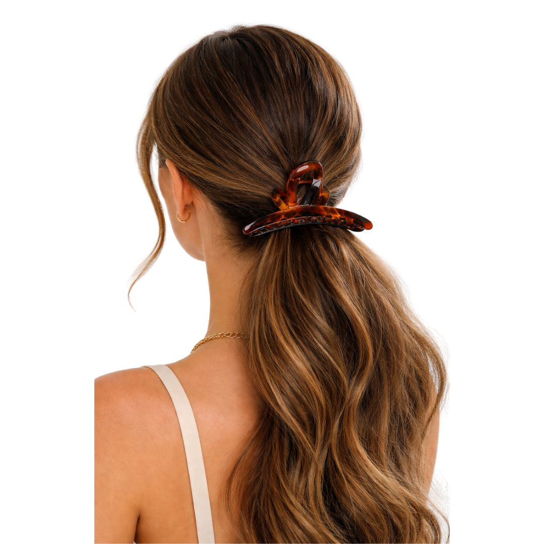 Clema de par mare, realizata in nuanta eleganta maro tortoise, ideale pentru coafuri rapide si fixare sigura pe tot parcursul zilei.