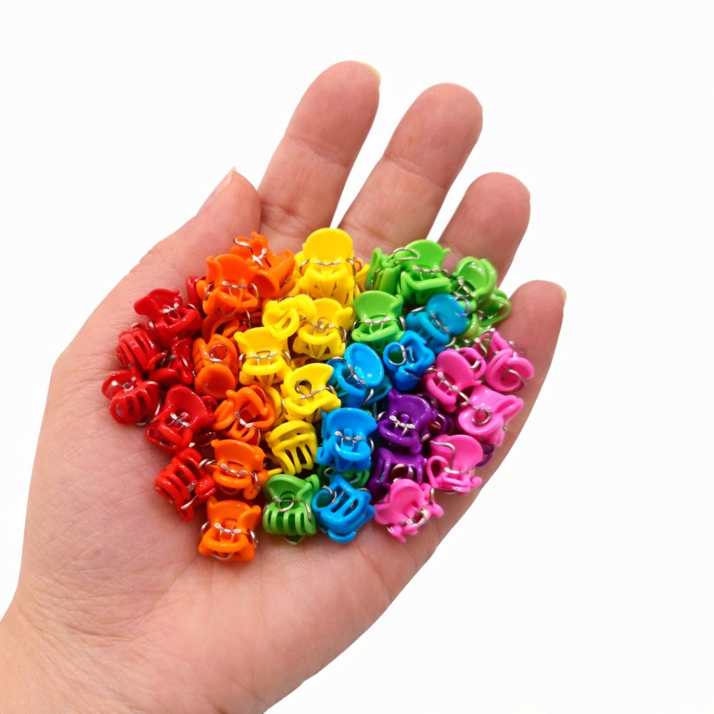 Set de 100 cleme de par mici, realizate in culori vibrante si variate, ideale pentru coafuri rapide, organizarea suvitelor sau utilizare zilnica. Dimensiunea compacta le face potrivite pentru fixarea precisa a parului.