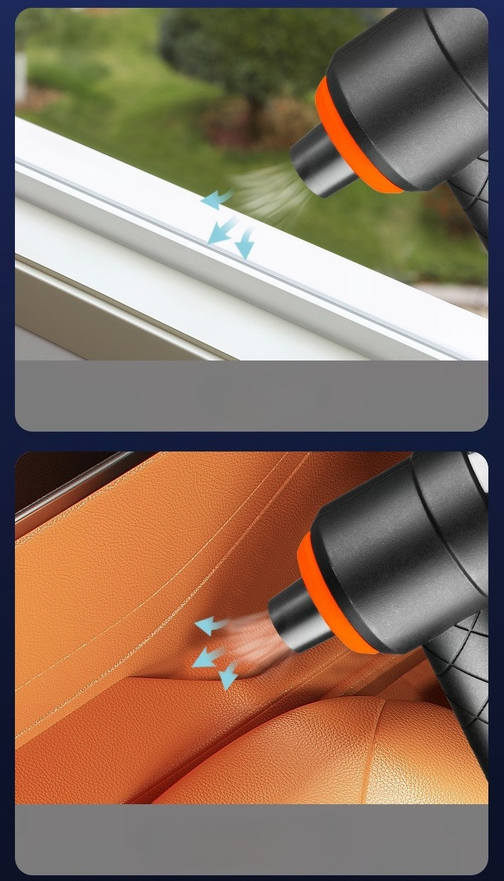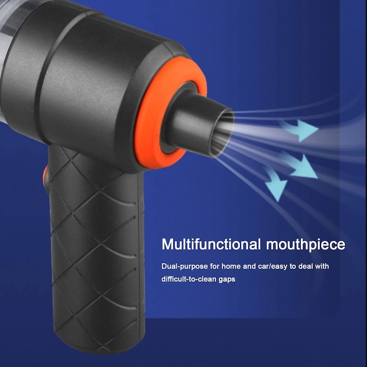 Aspiratorul portabil wireless, de culoare negru, tip pistol, este solutia ideala pentru curatarea rapida si eficienta a spatiilor mici, atat in masina, cat si in locuinta. Datorita designului compact si ergonomic, acest dispozitiv poate fi utilizat cu usurinta in zone greu accesibile precum spatiile dintre scaune, bord, grile de ventilatie sau colturi inguste. Functionalitatea dubla de aspirare si suflare il transforma intr-un instrument versatil, perfect pentru indepartarea prafului, firimiturilor sau altor particule fine.