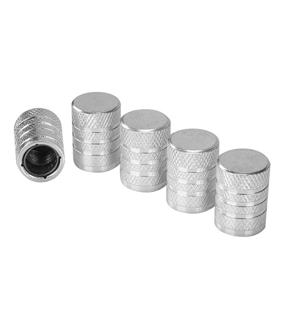 Setul contine 5 capace, suficiente pentru toate rotile, cu o piesa de rezerva inclusa. Capace de supapa din aluminiu cu insertie filetata din plastic, set 5 bucati, argintii.