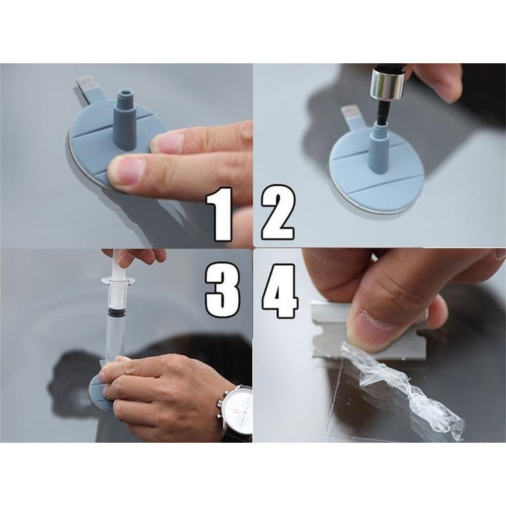 Kit complet pentru repararea rapida si eficienta a parbrizului auto, conceput pentru indepartarea aschiilor, ciobiturilor si zgarieturilor fine cauzate de impactul pietrelor sau altor obiecte mici. Acest set este ideal pentru interventii rapide acasa, fara echipamente speciale sau experienta tehnica, ajutand la restabilirea claritatii sticlei si la prevenirea extinderii fisurilor in timp. Aplicarea corecta a rasinii speciale contribuie la refacerea structurii zonei afectate si la mentinerea sigurantei in timpul conducerii.