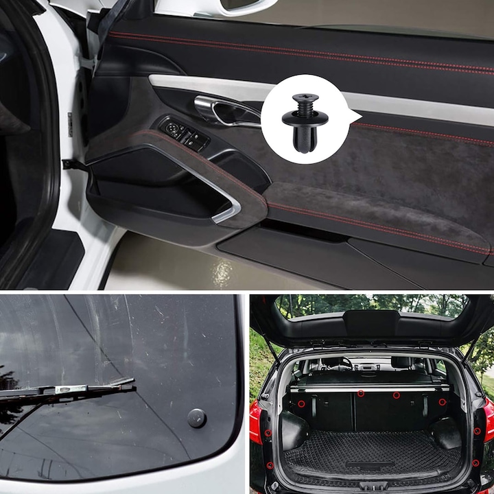 Clemele sunt fabricate din plastic premium rezistent la uzura, vibratii si coroziune, oferind o fixare sigura si durabila. Datorita designului tip impingere, montajul este rapid si simplu, fara riscul de a zgaria sau deteriora suprafetele masinii.