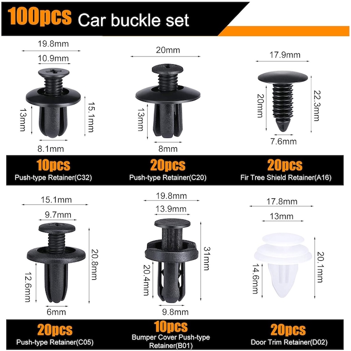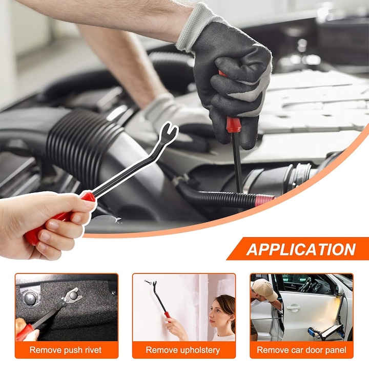 Setul include 6 tipuri diferite de cleme, utilizate frecvent pentru bare de protectie, panouri de usa, ornamente interioare, scuturi, capota si elemente decorative. In plus, sunt incluse 5 unelte de demontare care permit indepartarea usoara a clemelor vechi, fara a afecta caroseria.