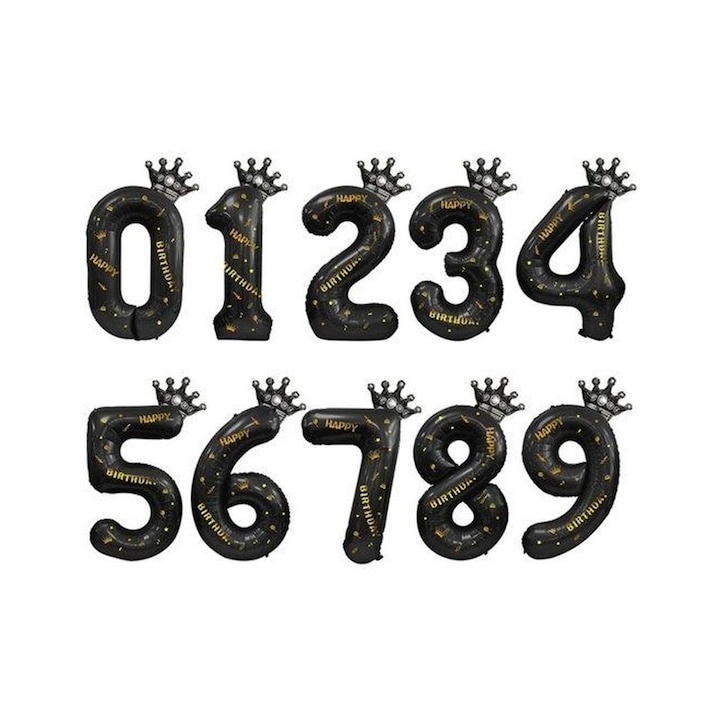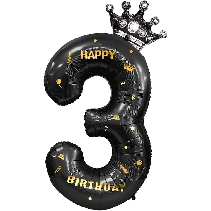 Balon folie cifra 3 cu coroana Happy Birthday 100 cm, negru, umflare aer sau heliu, aniversare decor petrecere