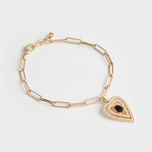 Designul său armonios evidențiază lanțul auriu elegant, completat de pandantive delicate în formă de inimă decorate cu efect de perlă și detalii negre din sticlă, care adaugă profunzime și contrast. Realizată cu atenție la fiecare detaliu, brățara Pia Heart reflectă lumina cu grație, oferind un plus de rafinament și feminitate oricărei apariții.