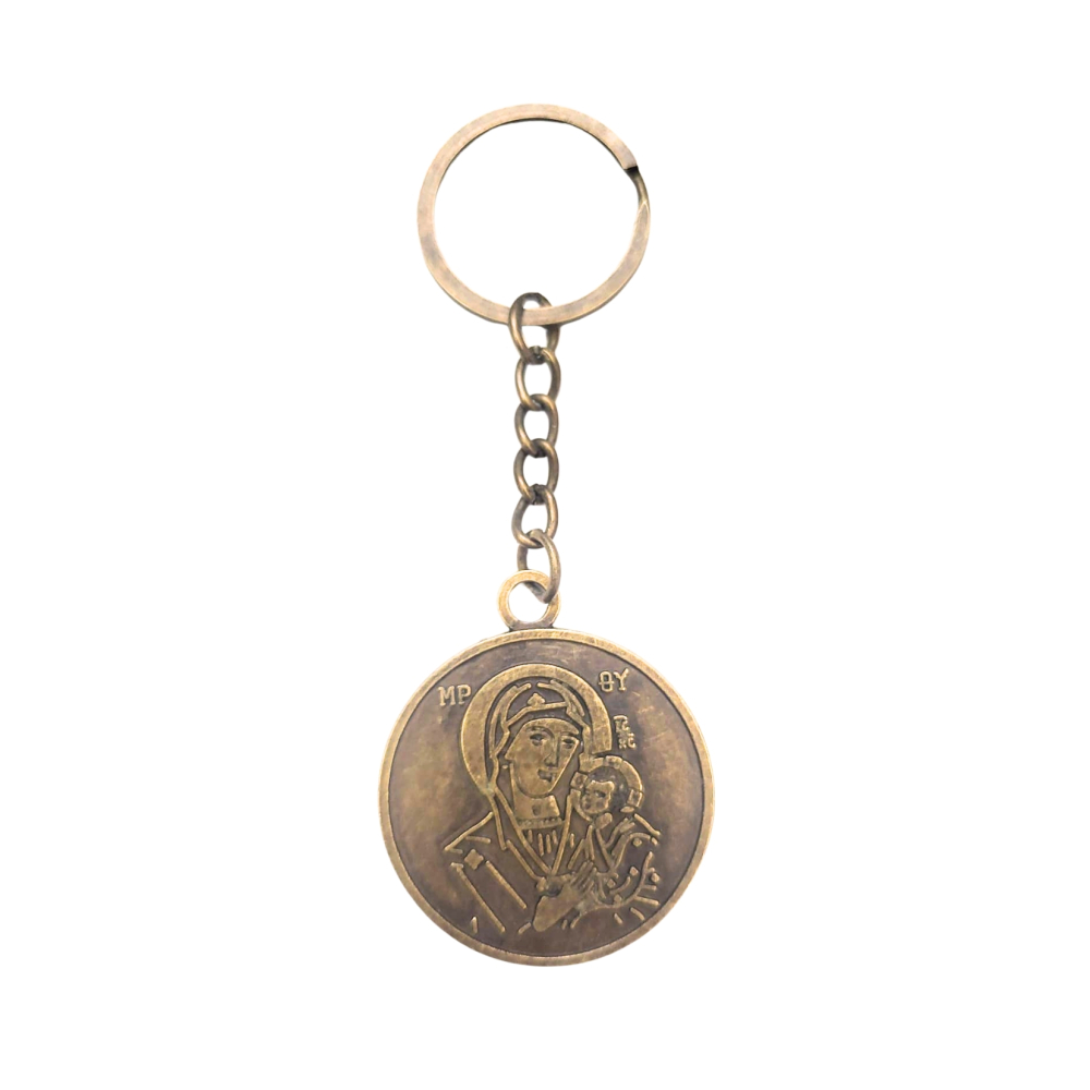 Acest breloc religios cu aspect vintage este realizat din metal si are un design clasic, cu model dublu in relief, inspirat din iconografia traditionala. Finisajul in nuanta maro antichizat ofera un aspect sobru si autentic, potrivit pentru cei care apreciaza obiectele cu simbolistica spirituala si stil retro.