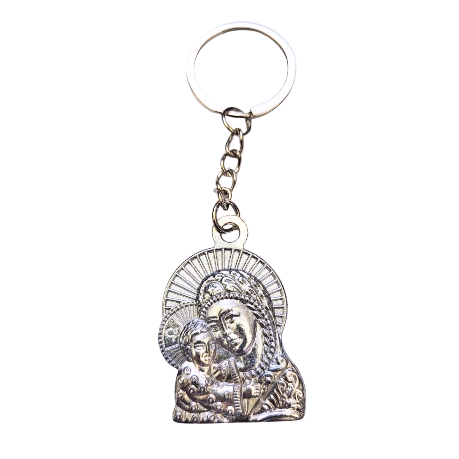 Acest breloc religios simbolic este realizat din metal rezistent, cu finisaj argintiu, si prezinta un model clasic inspirat din iconografia crestina. Designul detaliat il face usor de recunoscut si potrivit pentru cei care apreciaza accesoriile cu semnificatie spirituala, purtate discret in viata de zi cu zi.
