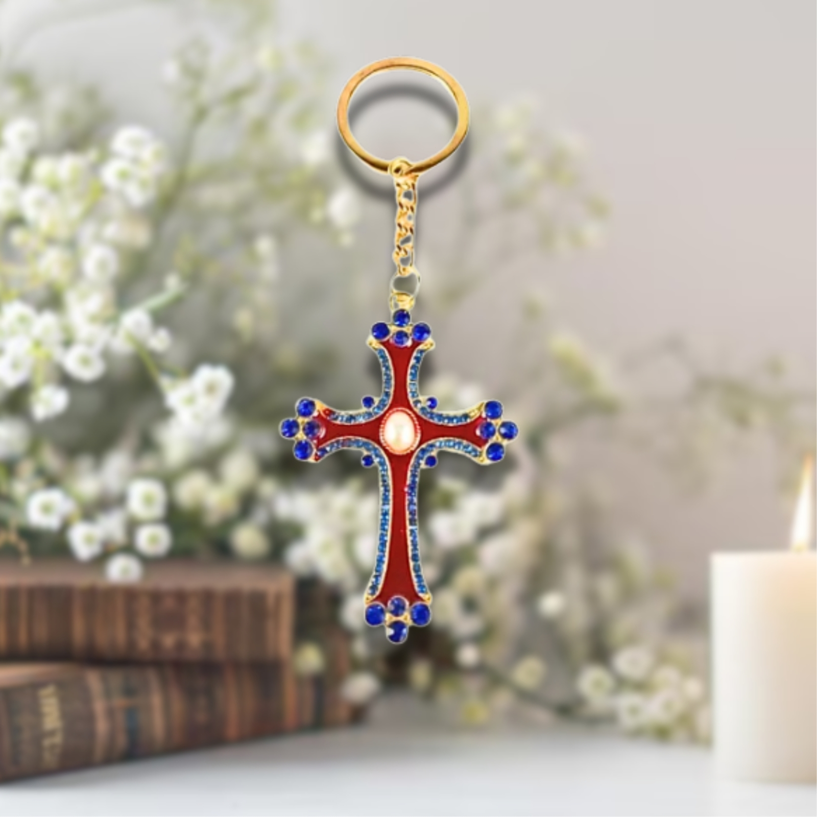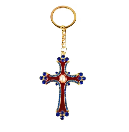 Acest breloc metalic auriu cu forma de cruce este un accesoriu vizibil si elegant, potrivit pentru chei, geanta, rucsac sau portchei. Designul este accentuat de elemente decorative colorate, care ii dau un aspect deosebit si il fac usor de recunoscut dintr-o privire, mai ales cand ai mai multe chei sau accesorii impreuna. Dimensiunea generoasa de 120 x 45 mm il transforma intr-un breloc practic, care se gaseste rapid in geanta sau buzunar.