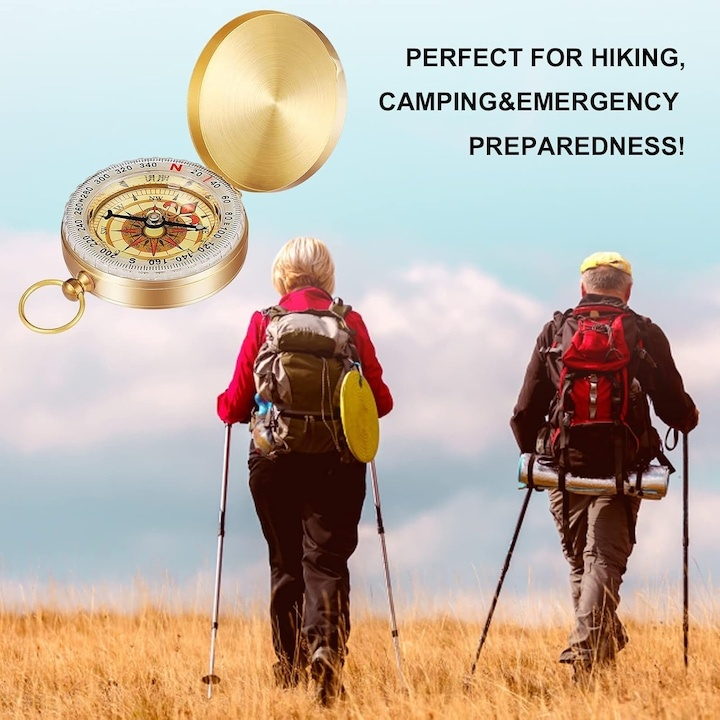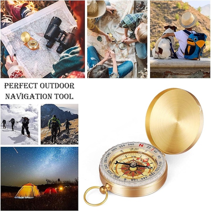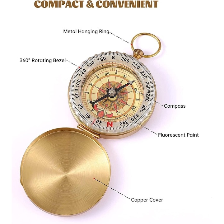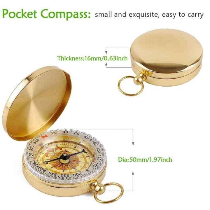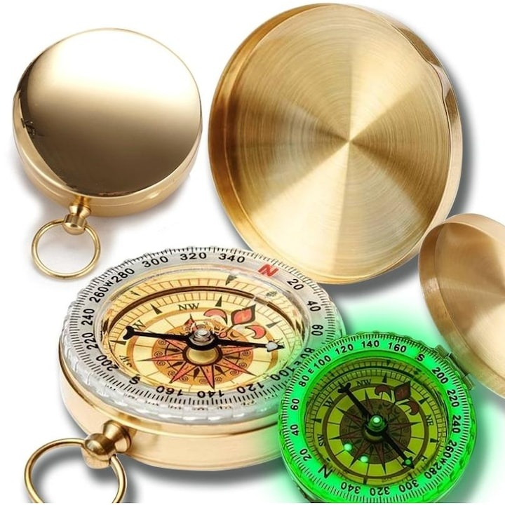 Busola portabila cupru rotire 360°, impermeabila, functie fluorescenta, design retro breloc, pentru camping drumetii si orientare, aurie