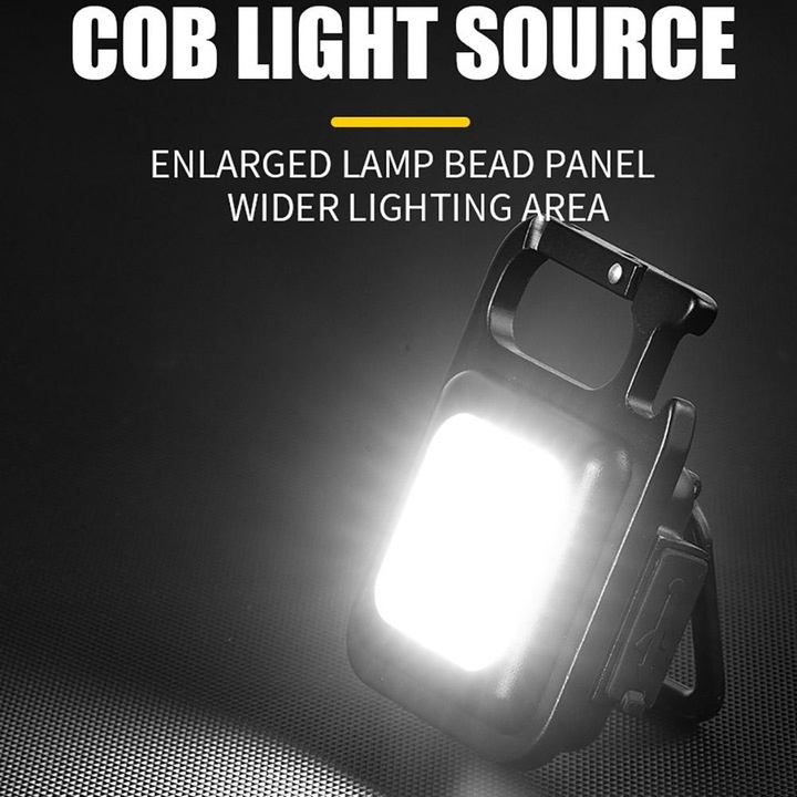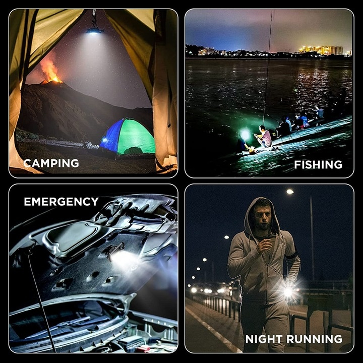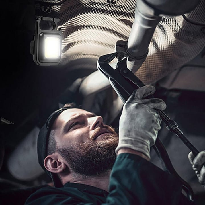 Unul dintre avantajele majore ale acestei lanterne este magnetul integrat in baza sa, care permite fixarea rapida pe orice suprafata metalica. Astfel, poti avea ambele maini libere in timpul lucrului, fie ca efectuezi reparatii sub capota masinii, montezi un obiect, sau ai nevoie de iluminare stabila in atelier. De asemenea, suportul pliabil incorporat ofera libertate totala in orientarea luminii, permitand reglarea unghiului pentru a directiona fasciculul exact unde este nevoie.