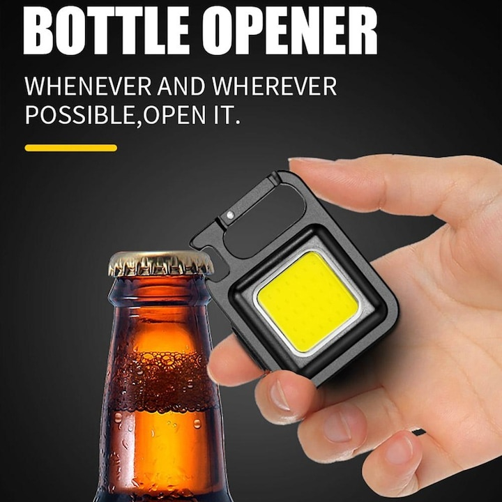 Un detaliu inedit, dar extrem de util, este deschizatorul de bere integrat in carcasa. Acest mic accesoriu transforma lanterna intr-un instrument multifunctional, perfect pentru camping, picnicuri sau seri relaxante in aer liber. In plus, prezenta carabinei o face usor de prins de rucsac, curea, trusa de scule sau breloc, pentru a fi mereu la indemana atunci cand ai nevoie.