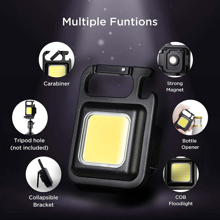 Designul sau modern si functional imbina eleganta formei patrate cu rezistenta materialelor de calitate superioara. Corpul este realizat din ABS durabil, cu o textura mata care ofera aderenta si protectie impotriva zgarieturilor si socurilor usoare. Dimensiunile compacte permit transportul lanternei in buzunar, in geanta, in rucsac sau chiar agatata de chei, datorita carabinei metalice integrate. Este perfecta pentru camping, pescuit, drumetii, reparatii auto, ateliere sau pur si simplu ca lanterna de urgenta in casa ori in masina.
