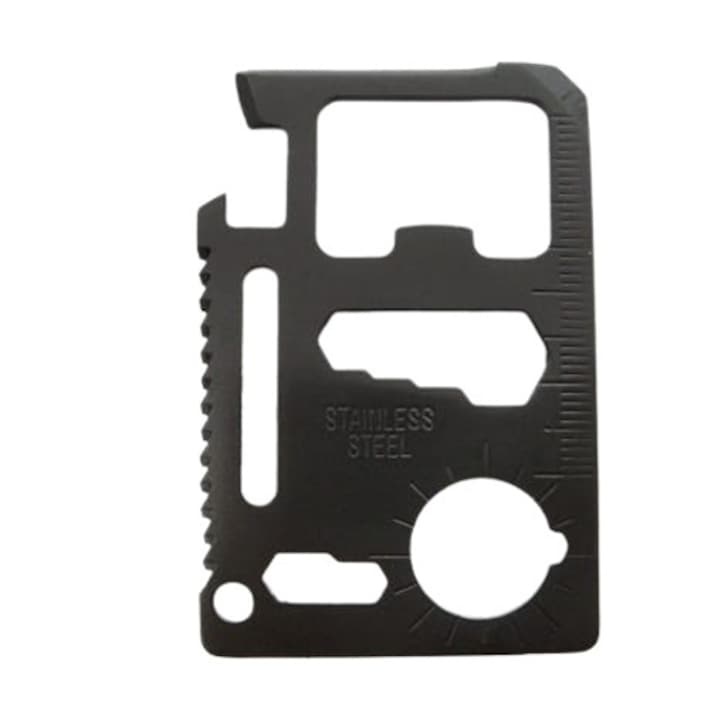 Card multifunctional supravietuire 11 functii, otel dur, portofel EDC, cu husa, compact 70x45 mm, negru
