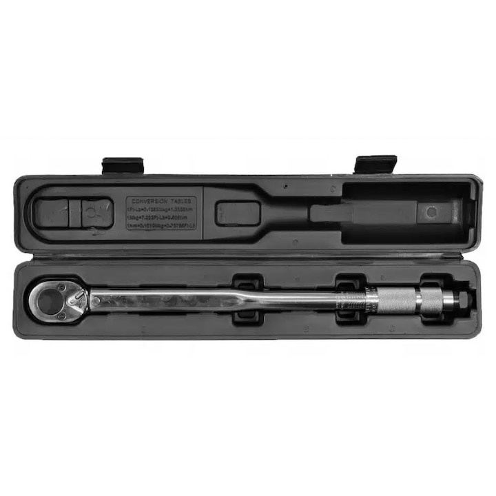 Fabricata din otel-crom de inalta rezistenta, aceasta cheie dinamometrica ofera durabilitate ridicata si rezistenta la coroziune. Capul cu clichet bidirectional permite utilizarea atat pentru strangere, cat si pentru desurubare, iar sistemul de blocare mentine constanta valoarea setata a cuplului pe durata lucrului. Scala gravata este clara si usor de citit, permitand reglaje precise, cu pas de 1 Nm.