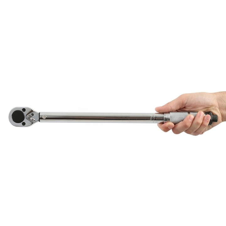 Cheie dinamometrica cu clichet, tija 1/2 inch, otel-crom, cuplu reglabil 42-210 Nm, lungime 46.5 cm, culoare argintie