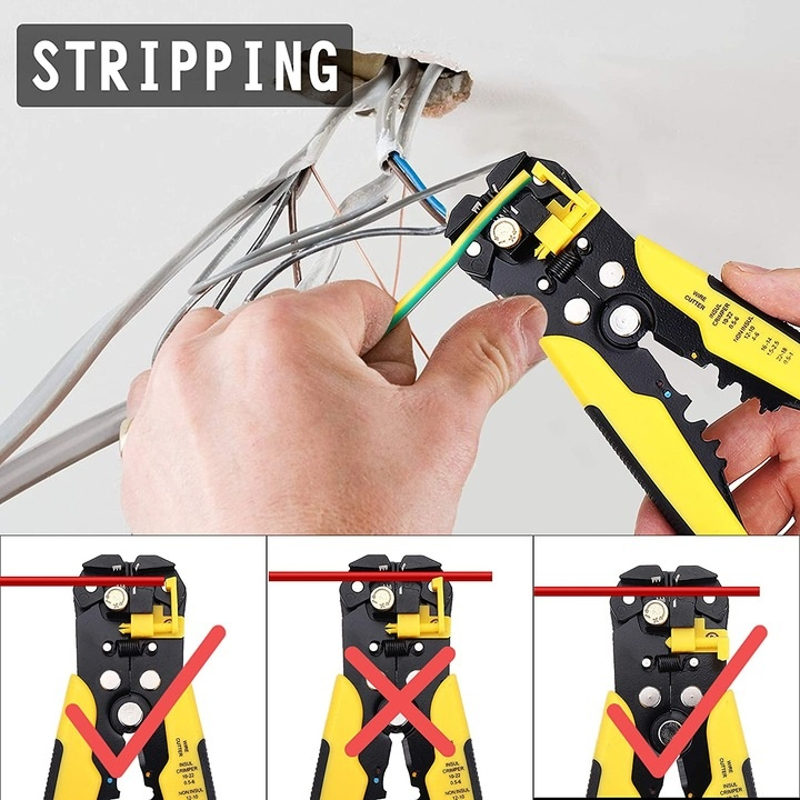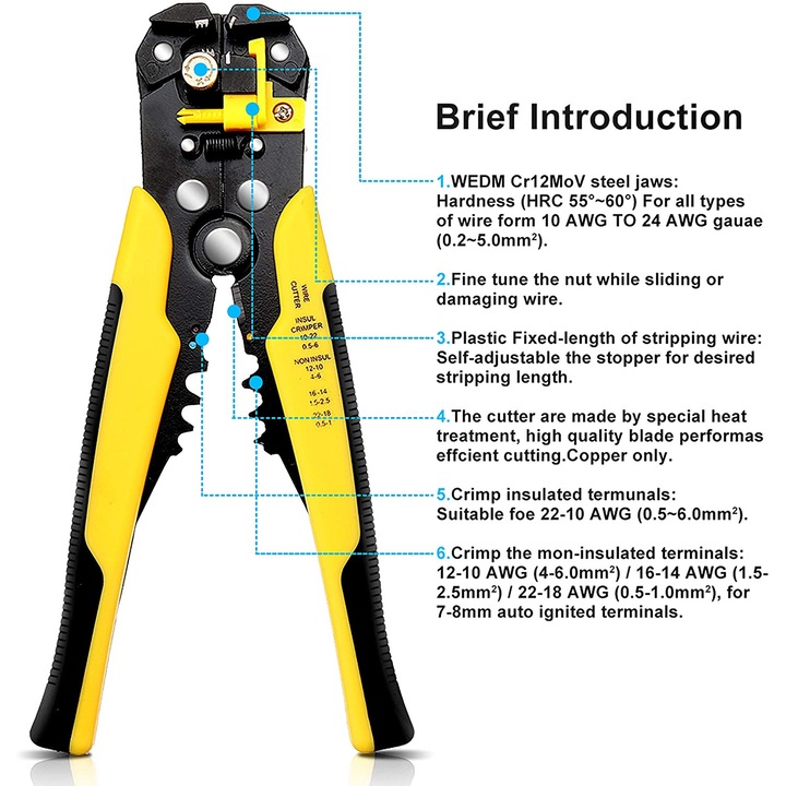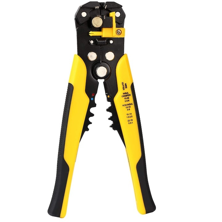 Cleste dezizolare si sertizare cablu, top reglabil cu limitator, 20x10x3 cm, negru-galben