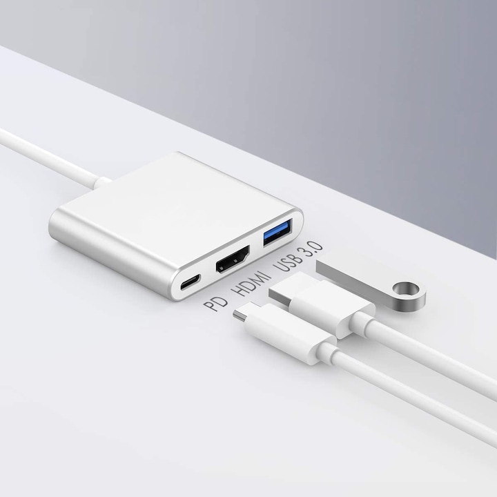 Continut pachet: Hub adaptor USB Type-C la HDMI + USB 3.0 + PD