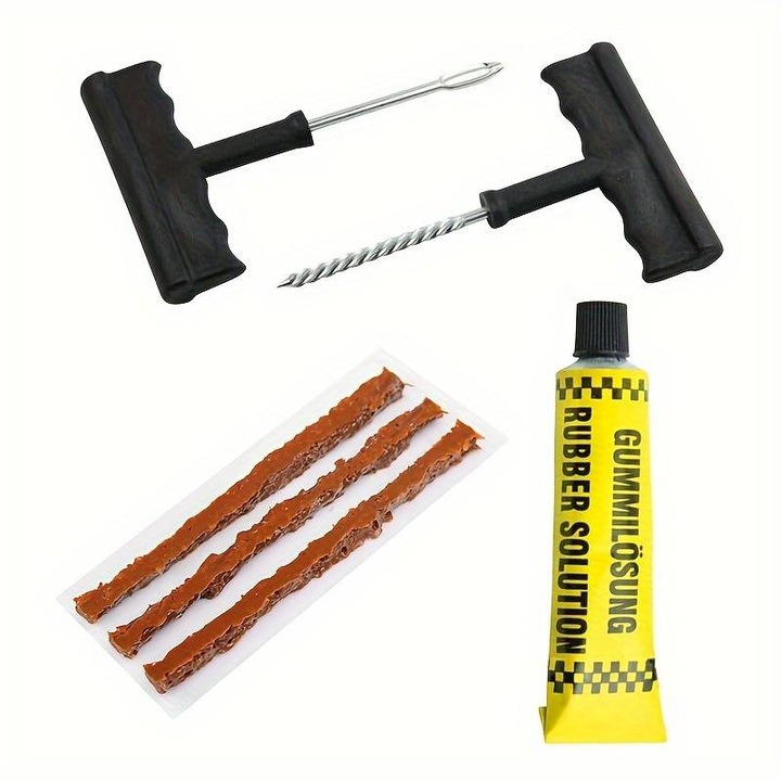 Snururile din material rezistent, impreuna cu adezivul special pentru cauciuc, asigura o etansare eficienta si o prindere ferma. Kitul este potrivit pentru autoturisme si alte vehicule compatibile cu acest tip de reparatie, oferind o solutie practica pentru soferi profesionisti si utilizatori obisnuiti. Dimensiunile compacte il fac usor de depozitat in portbagaj.