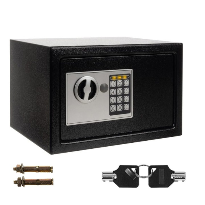 Seif metalic antiefractie conceput pentru protectia eficienta a bunurilor personale, combinand siguranta tehnologica cu un design sobru si discret. Fabricat din otel rezistent, acest seif ofera o solutie practica pentru pastrarea documentelor, banilor, bijuteriilor sau a altor obiecte de valoare, fiind potrivit atat pentru locuinta, cat si pentru birou. Dimensiunile compacte permit integrarea usoara in spatii restranse, fara a compromite capacitatea utila de aproximativ 10 litri.