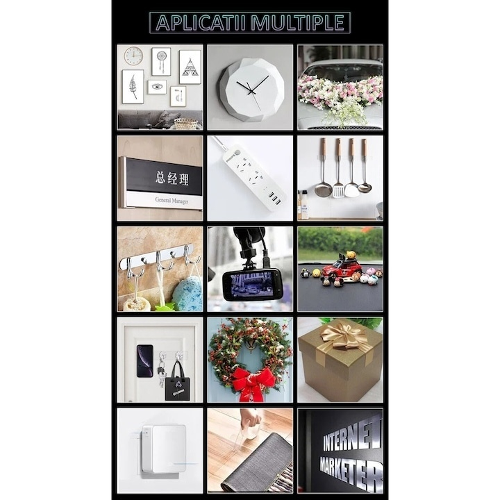 🏠 Benzile se pot aplica pe lemn, sticla, metal, plastic, gresie sau marmura, fiind ideale pentru fixarea carligelor, ramelor foto, covoraselor, suporturilor de telefon, cablurilor sau decoratiunilor. Se pot taia la dimensiunea dorita, oferind libertate totala in utilizare.