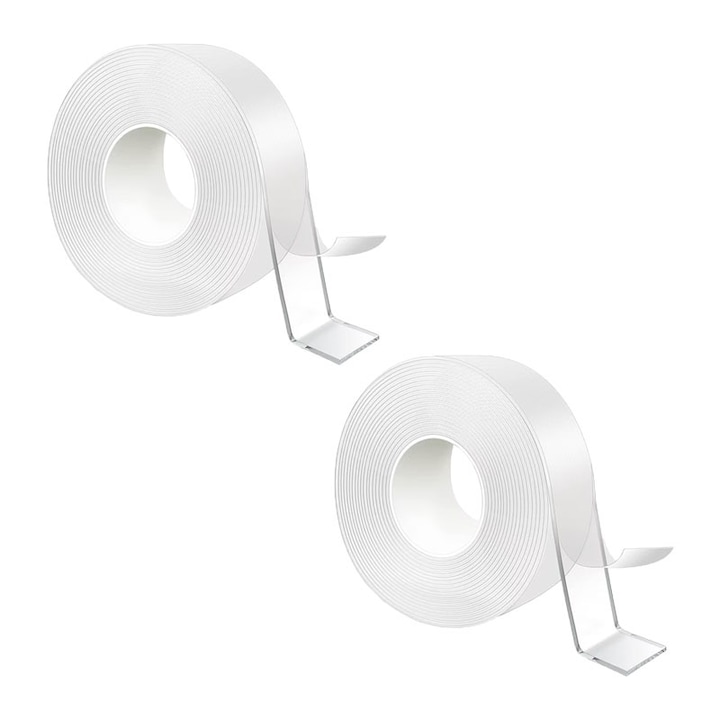 Set 2 benzi dublu adezive transparente, 5 metri pe rola, siliconice, flexibile, rezistente la apa, reutilizabile, nu lasa urme, aplicabile pe diverse suprafete