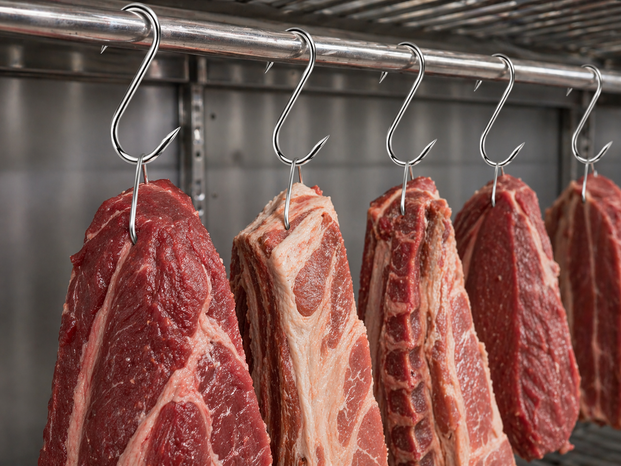 Acestea sunt carlige in forma de S, utilizate frecvent in industria alimentara pentru suspendarea carnii. Constructia lor permite fixarea sigura si usoara a bucatilor mari de carne sau a preparatelor, asigurand stabilitate in timpul procesarii.
