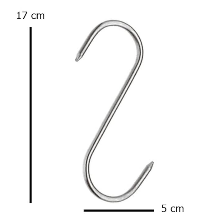 Carligele inox in forma de S ofera durabilitate si functionalitate, fiind ideale pentru suspendarea carnii sau organizarea eficienta in bucatarie sau afumatoare.