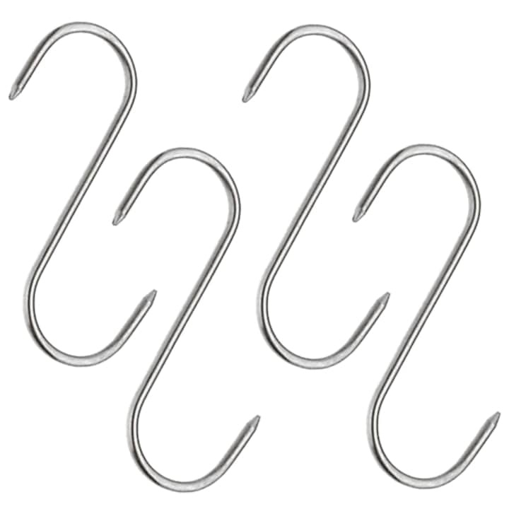 Carligele inox in forma de S ofera durabilitate si functionalitate, fiind ideale pentru suspendarea carnii sau organizarea eficienta in bucatarie sau afumatoare.