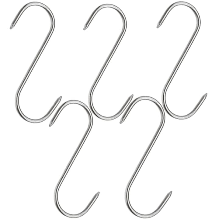 Carligele inox in forma de S ofera durabilitate si functionalitate, fiind ideale pentru suspendarea carnii sau organizarea eficienta in bucatarie sau afumatoare.