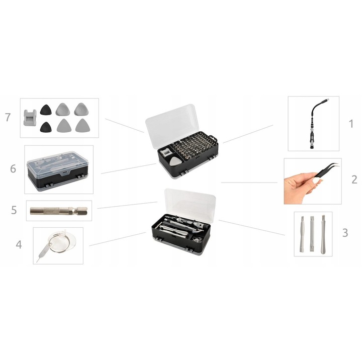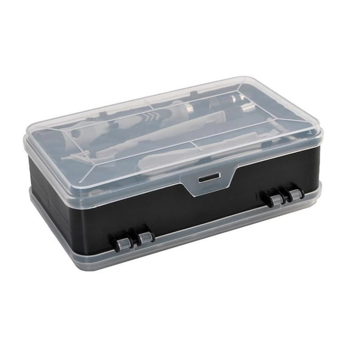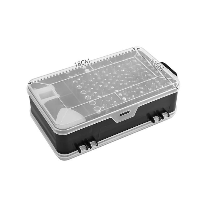 Aceasta trusa dubla de surubelnite cu 110 piese este conceputa pentru lucrari de precizie si interventii rapide asupra dispozitivelor electronice si obiectelor sensibile. Setul este potrivit pentru telefoane, tablete, laptopuri, ceasuri, ochelari, aparate foto sau alte echipamente care necesita capete speciale si control ridicat.