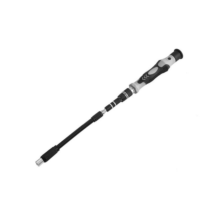 Manerul metalic cu prindere magnetica asigura stabilitate si precizie, iar prelungitorul flexibil faciliteaza lucrul in zone greu accesibile. Designul portabil face ca trusa sa fie usor de transportat si ideala atat pentru utilizare acasa, cat si in deplasare.