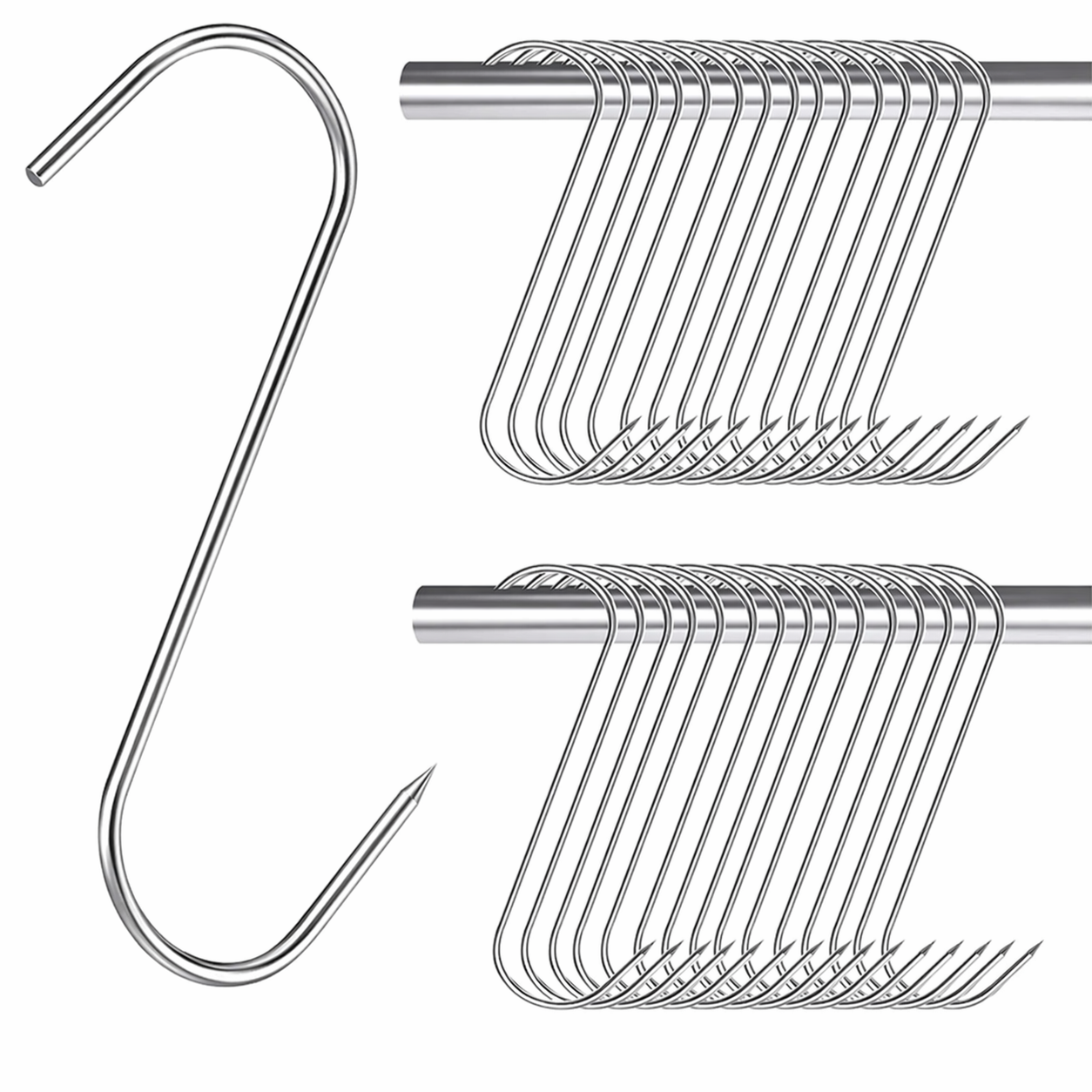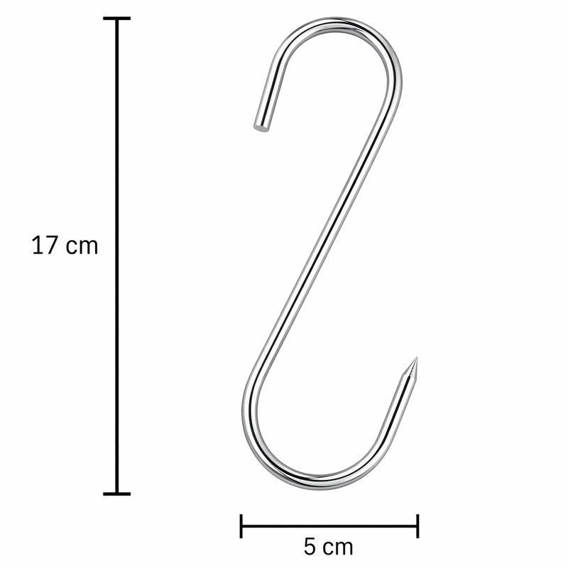 Carligele inox in forma de S ofera durabilitate si functionalitate, fiind ideale pentru suspendarea carnii sau organizarea eficienta in bucatarie sau afumatoare.