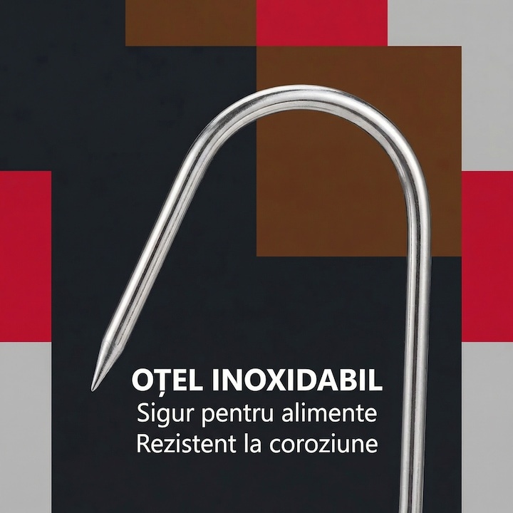 Designul functional include un capat ascutit pentru perforarea usoara a carnii si un capat bont pentru agatare sigura. Aceasta configuratie asigura manipulare eficienta si utilizare rapida.