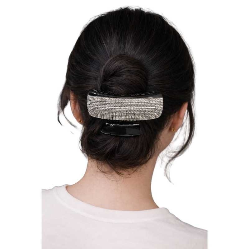 Clema de par eleganta in finisaj negru lucios, decorata integral cu cristale argintii stralucitoare, ideala pentru coafuri rafinate si aparitii elegante. Designul lat ofera sustinere eficienta si stabilitate sporita.