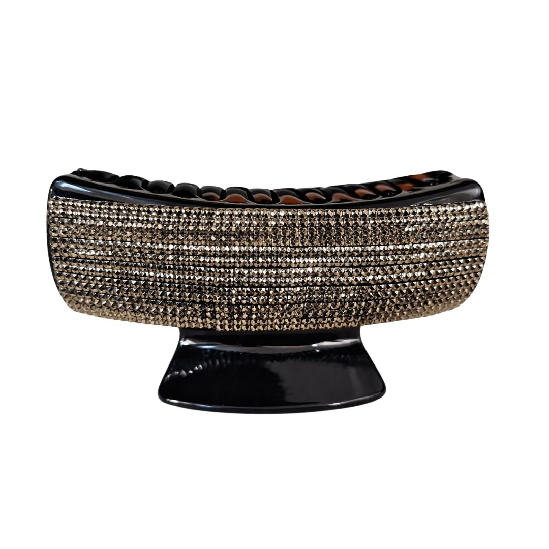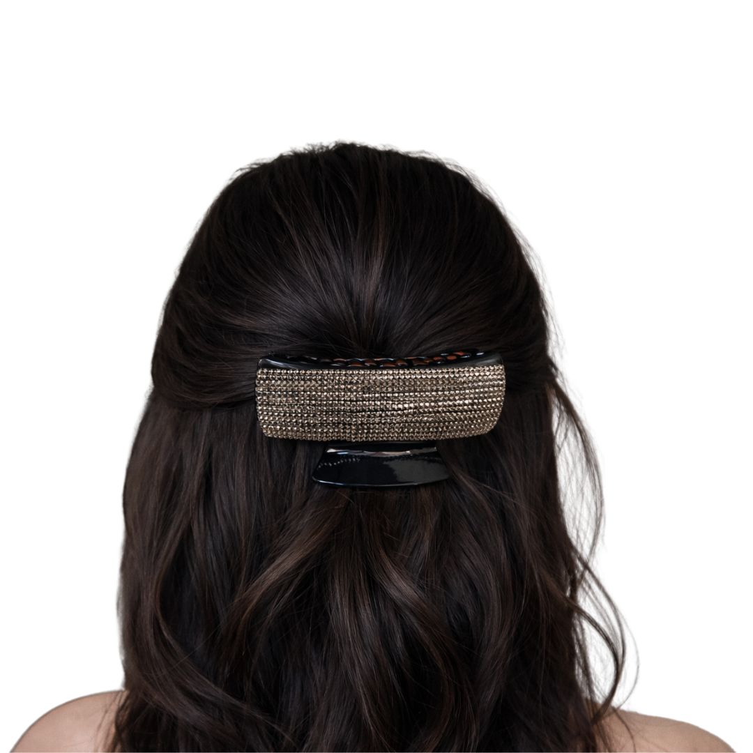 Clema de par eleganta in finisaj negru lucios, decorata integral cu cristale champagne stralucitoare, ideala pentru coafuri rafinate si aparitii stilate. Designul lat ofera sustinere eficienta si stabilitate sporita pentru par mediu sau lung.