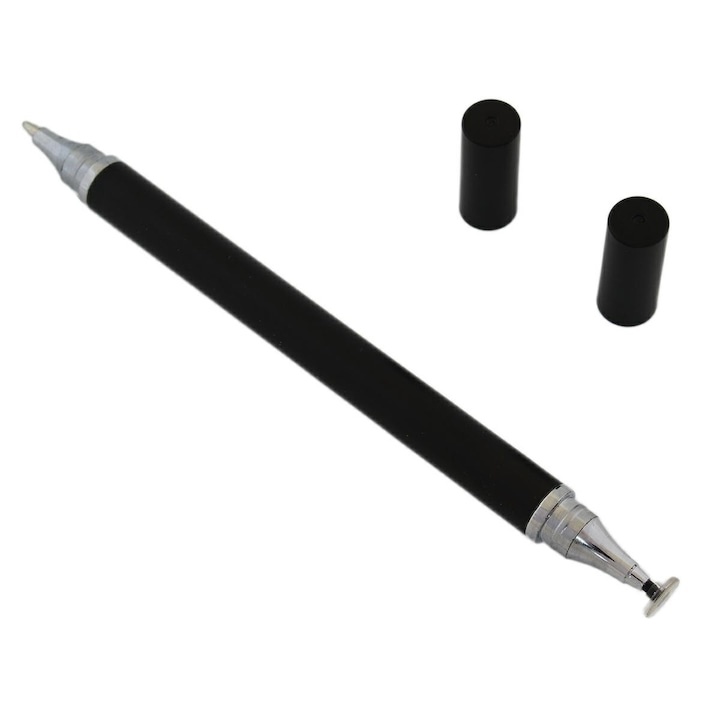 Creion stylus 2 in 1 pentru ecran tactil, universal, metal, negru, cu pix integrat si disc protectie display