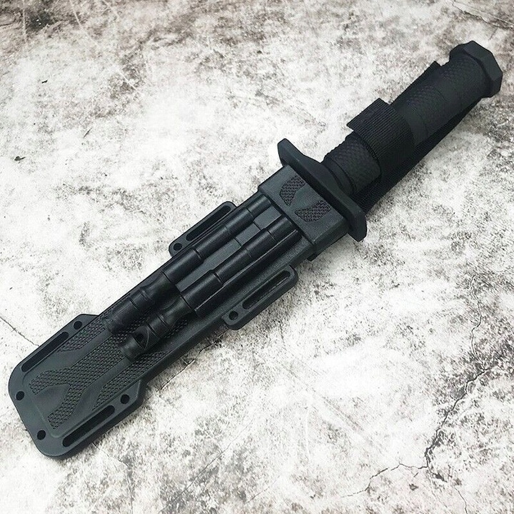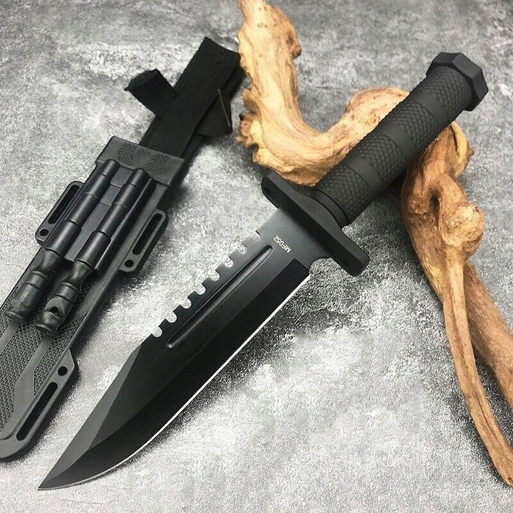 Acest cutit tactic de vanatoare este proiectat pentru utilizare intensa in conditii dificile, fiind ideal pentru activitati outdoor, camping sau supravietuire. Constructia robusta si accesoriile incluse il transforma intr-un instrument complet pentru orice expeditie.