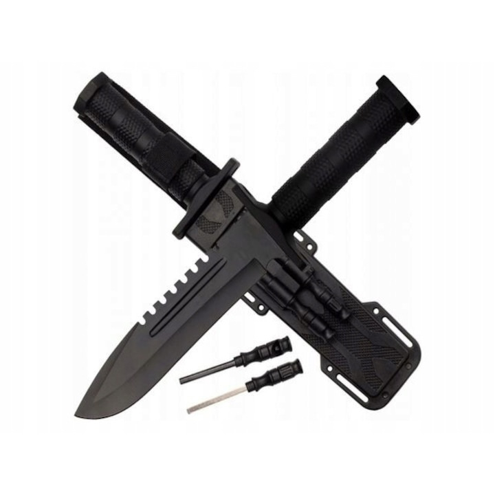 Cutit vanatoare tactic militar cu teaca multifunctionala, otel 420J2, lama fixa 31 cm, ascutitor, amnar si fluier incluse