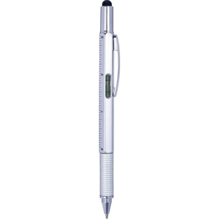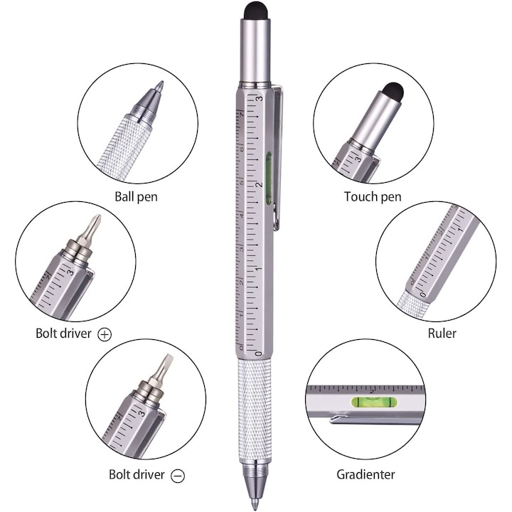Pix multifunctional 6 in 1 din aluminiu argintiu cu touch, nivela rigla 7 cm si surubelnita dubla, scriere neagra 14.8 cm