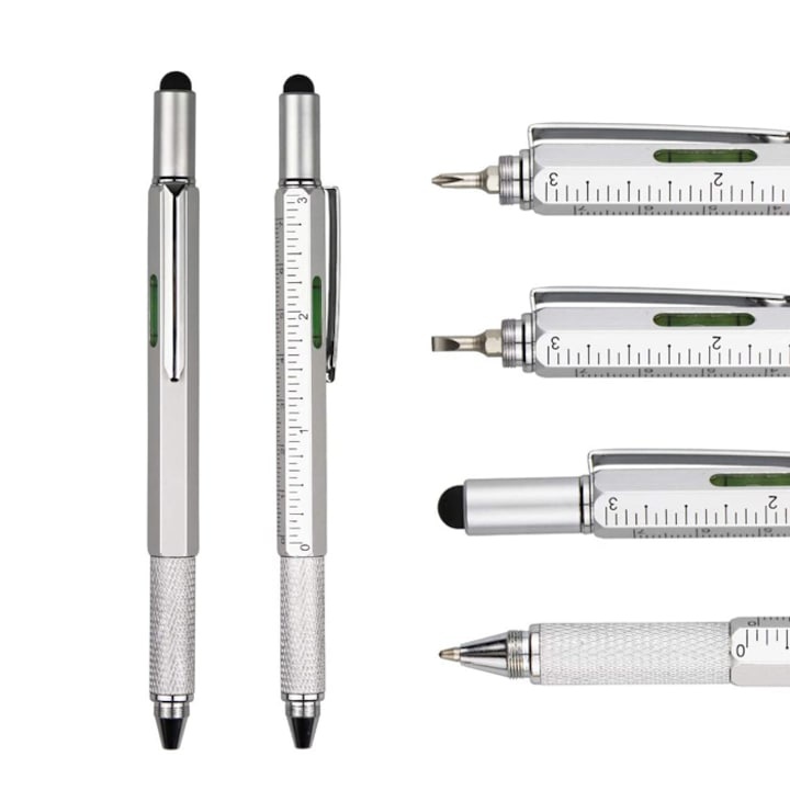 Pix multifunctional 6 in 1 din aluminiu argintiu cu touch nivela rigla 7 cm si surubelnita dubla scriere neagra 14.8 cm