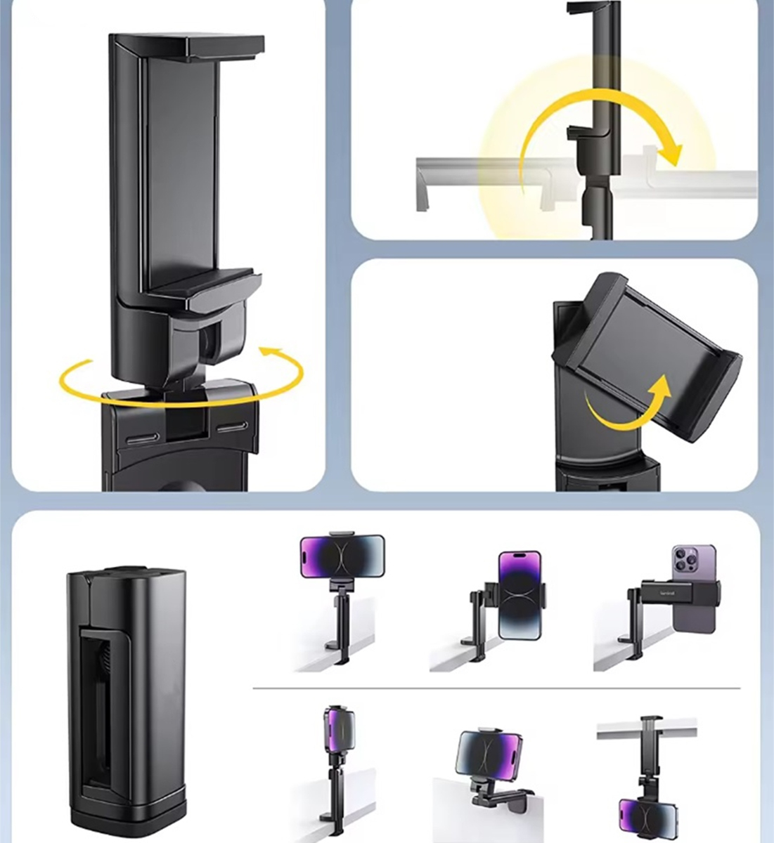 Suport universal pentru telefon, ABS, reglabil, rotire 360°, multifunctional, 9.3 x 3.7 x 3.5 cm, negru