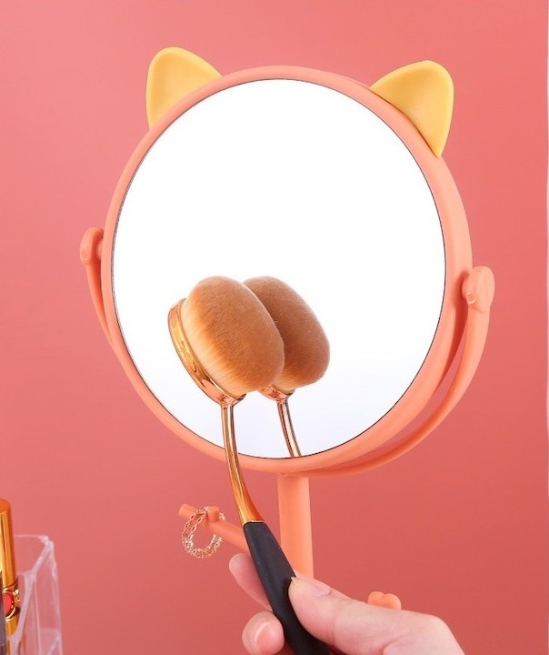 Oglinda cosmetica cu picior, portocaliu roz, rotire 360°, baza cu suport bijuterii, model urechi, 15 cm diametru, 31 x 14.5 x 15 cm