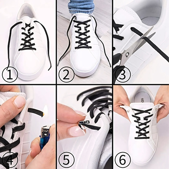 Montarea se face simplu: siretul se trece prin orificiile pantofului ca un siret normal, apoi capetele se fixeaza cu clemele magnetice. Materialul elastic permite ajustarea si intinderea usoara, fara sa stranga piciorul. Acest sistem elimina complet inconvenientul sireturilor traditionale care se desfac.