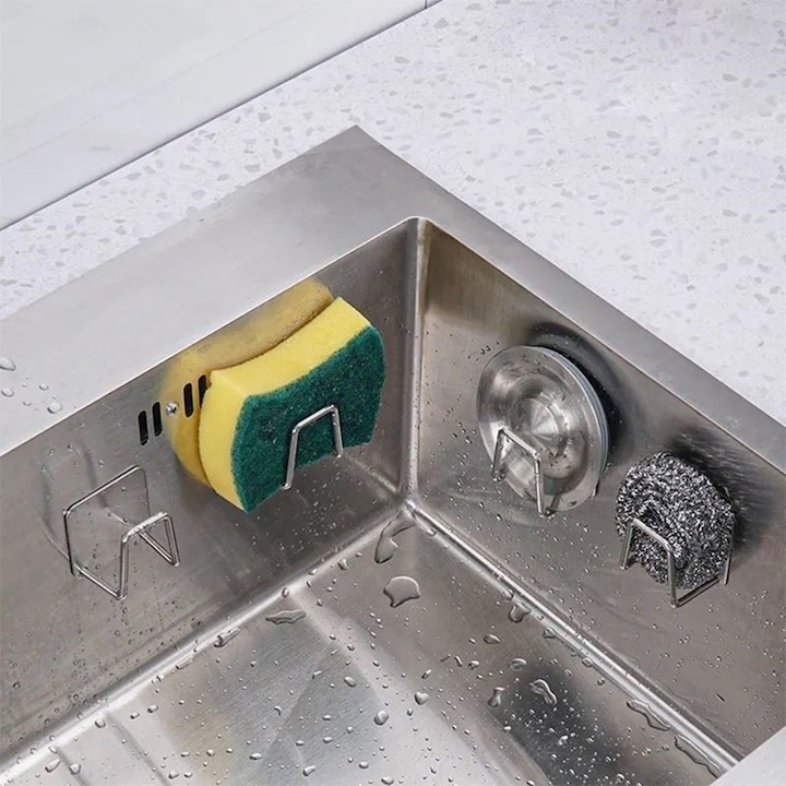 Suportul functioneaza ca un carlig multifunctional, adaptabil pentru diverse utilizari: poate sustine bureti, lavete, prosoape mici sau alte accesorii usoare. Uscarea suspendata a buretelui previne acumularea umezelii si dezvoltarea mirosurilor neplacute, contribuind la o igiena mai buna in bucatarie sau baie.