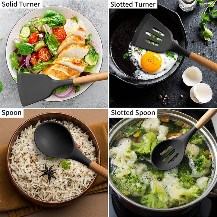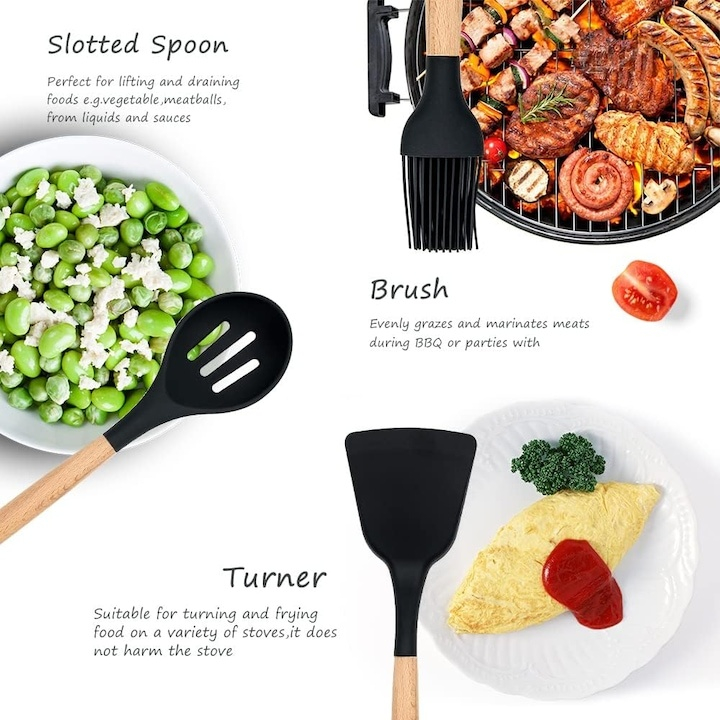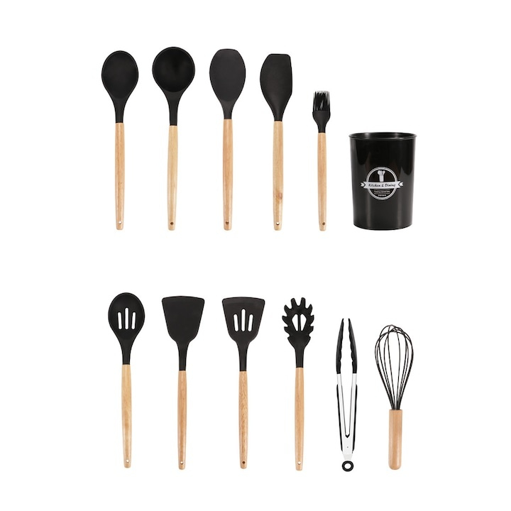 Set 11 ustensile de gatit din silicon, cu manere rezistente din lemn si suport de depozitare, rezistente la caldura, culoare neagra – kit complet pentru bucataria moderna
