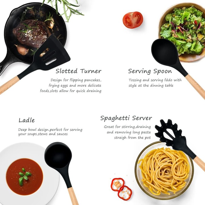 Setul contine instrumente esentiale pentru diverse tehnici culinare: amestecare, prajire, gatire, servire, amestecarea pastelor, turnarea sosurilor si multe altele. Indiferent ca preparati supe, deserturi, paste sau carne, veti avea intotdeauna la indemana ustensila potrivita.