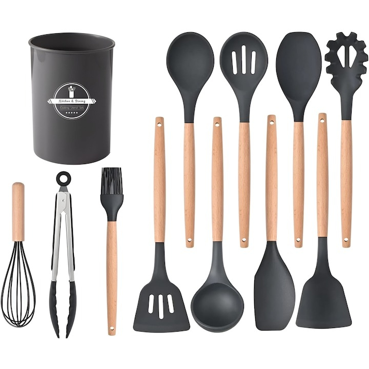 Set ustensile bucatarie, 12 piese, Lemn si Silicon alimentar, termorezistente, antiaderente, suport blat, spatula, polonic, cleste, lingura paste, tel, pensula, negre