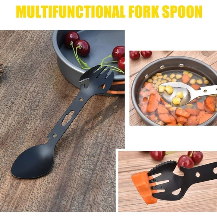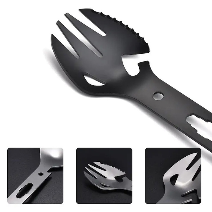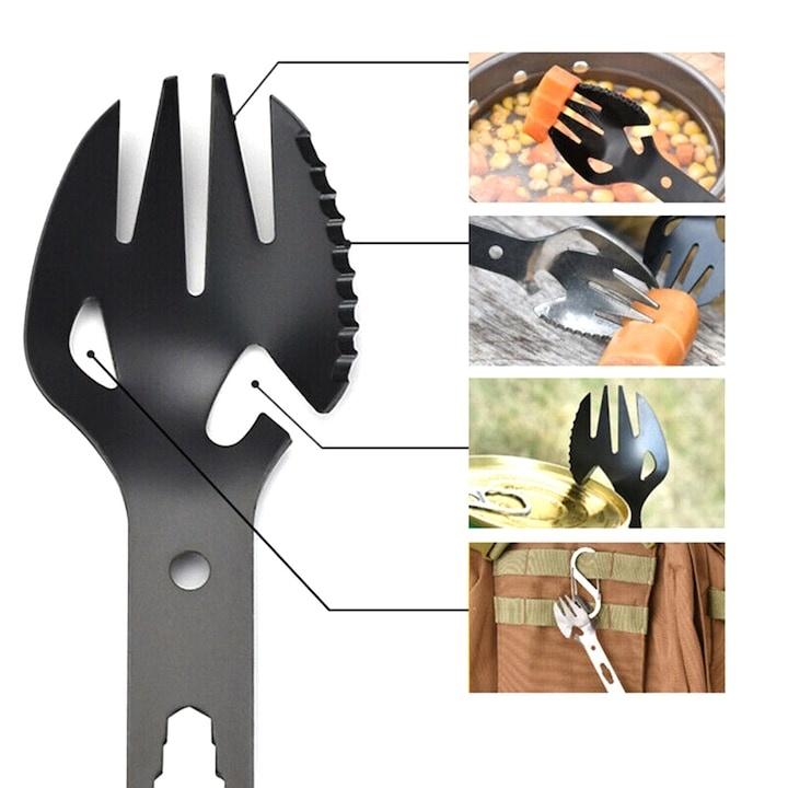 Elementele aditionale sporesc versatilitatea produsului, incluzand o cheie multifunctionala cu dimensiuni standard, orificiu pentru agatare si gauri de fixare. Acestea il transforma intr-un instrument util nu doar pentru mancat, ci si pentru mici ajustari sau fixari in timpul activitatilor outdoor.
